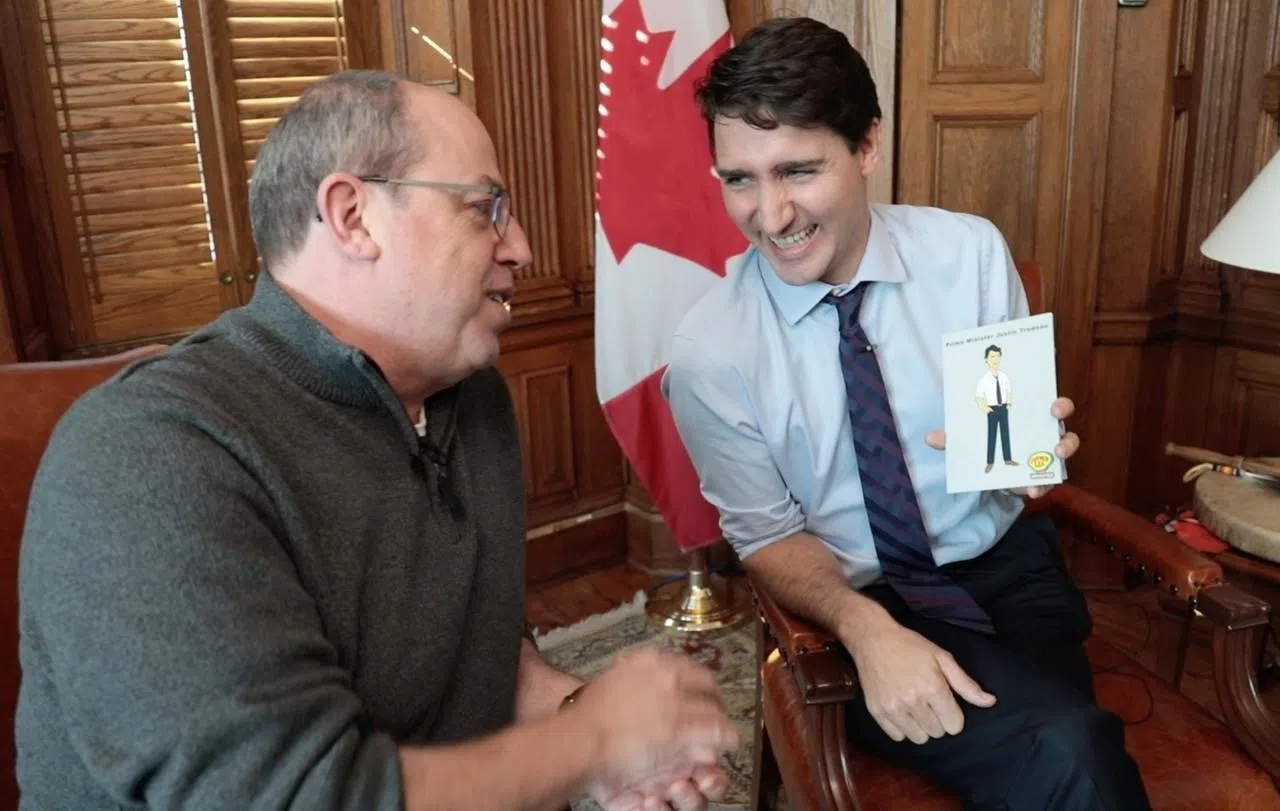 A photograph accompanies the post, showing Trudeau in his Parliament Hill office with sound technicians and “Corner Gas” star and creator Brent Butt.