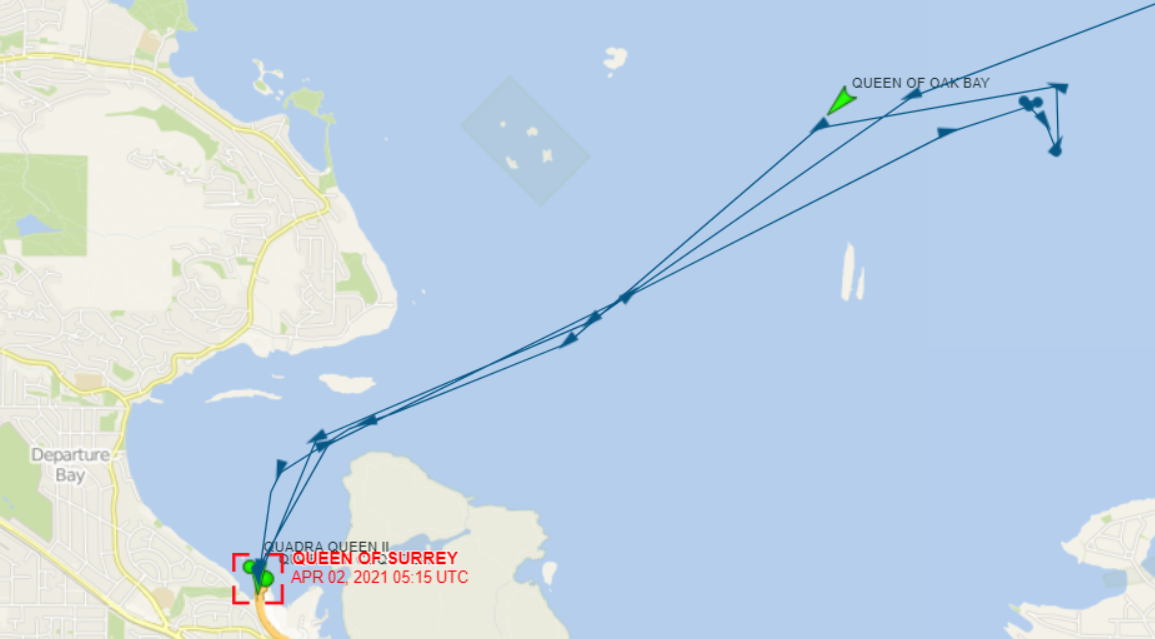The Queen of Surrey suspended its crossing to Horseshoe Bay in Vancouver and returned to Nanaimo after an emergency on April 1. (Ferry Tracker)