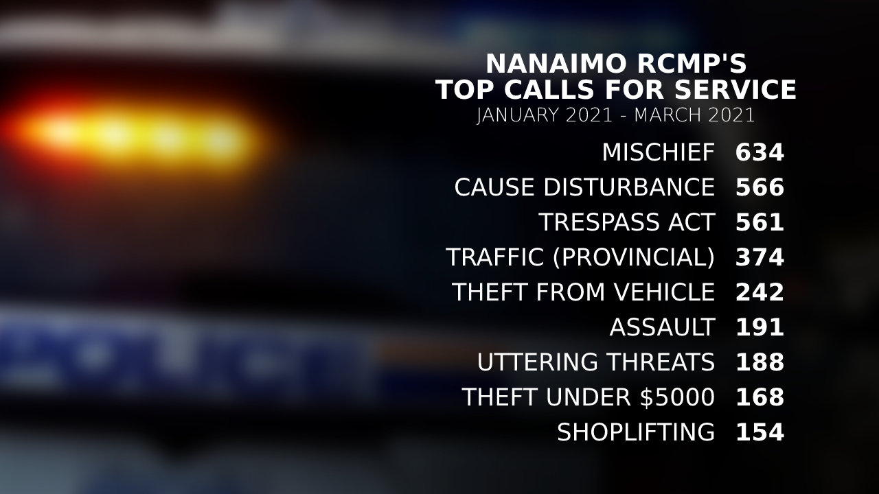 Despite the decrease, calls for mischief, including property damage, causing a disturbance and trespassing still made up a bulk of the requests police responded to between January and March 2021.