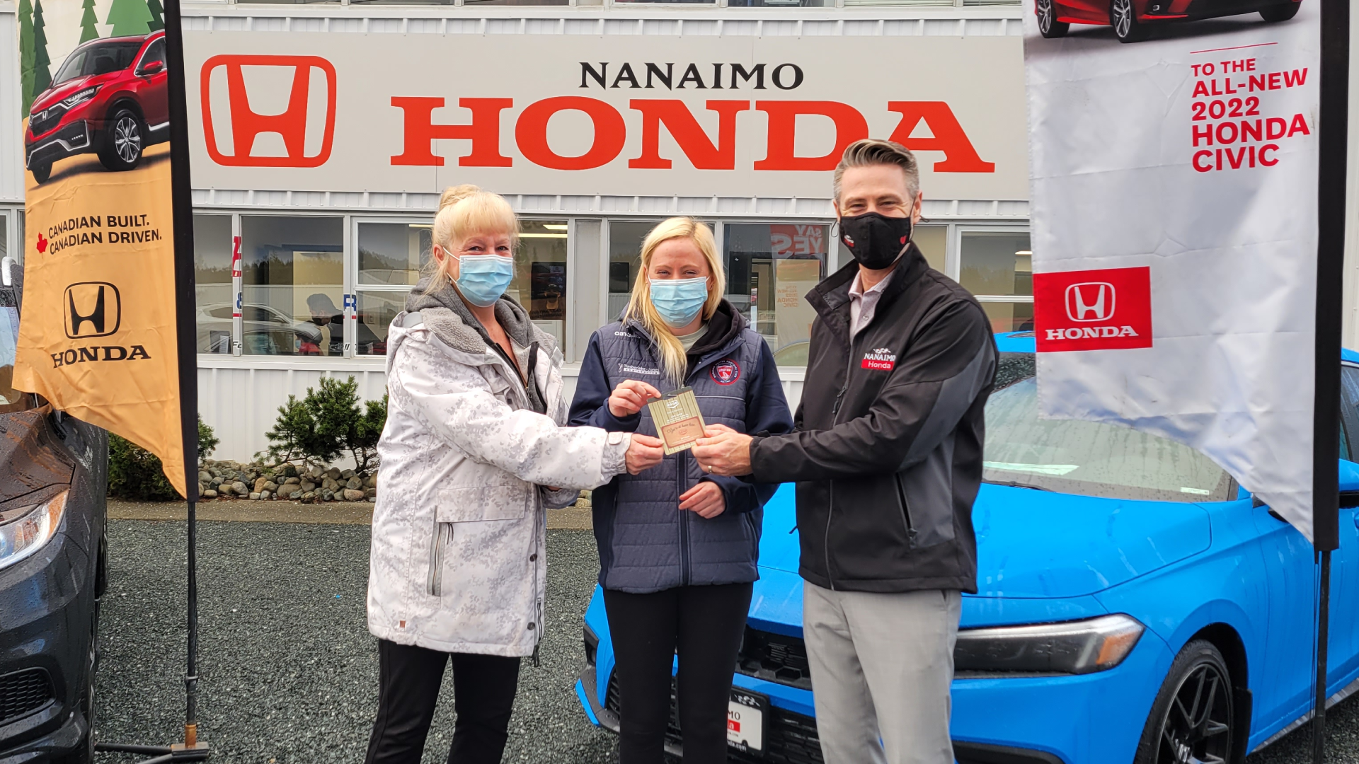 Kellie (left) and Casey (centre) Martin receive their $250 gas card from Paul Robson at Nanaimo Honda. The Martin’s were chosen as the winners of the 2021 Light Up The Island contest. (Alex Rawnsley/NanaimoNewsNOW)