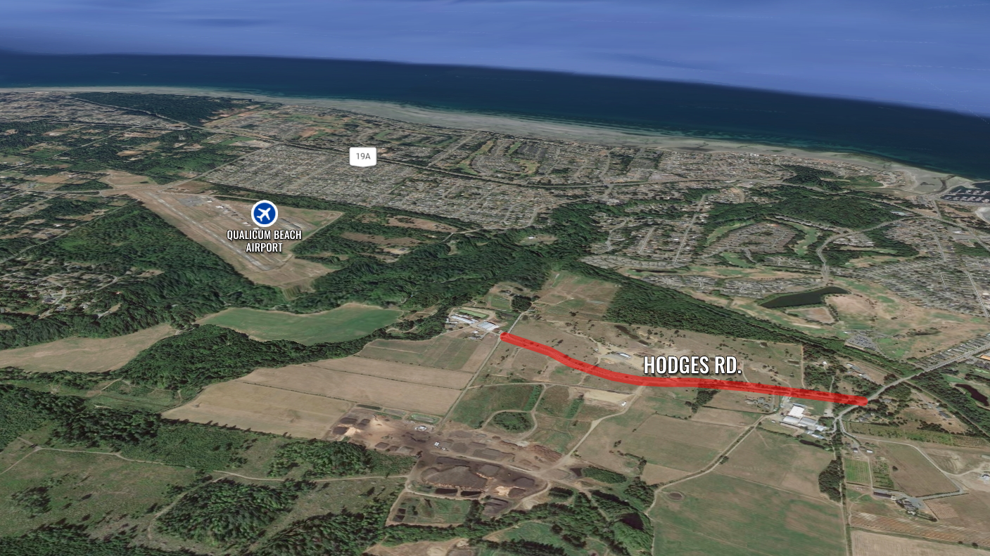 A single-engine Cessna has crashed into a farmer’s field off Hodges Rd., south of Qualicum Beach Airport, seriously injuring the pilot. (Google Earth)