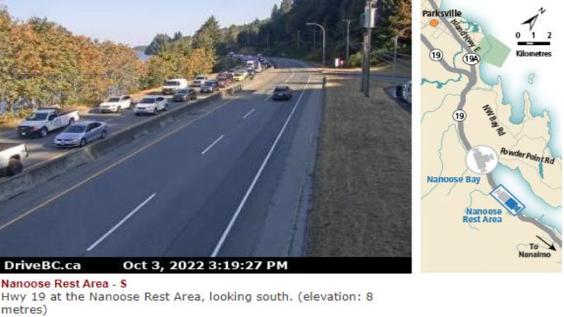 Traffic was gridlocked on Highway 19 heading north between Nanaimo and Parksville throughout the afternoon on Monday, Oct. 3 (Drive BC)