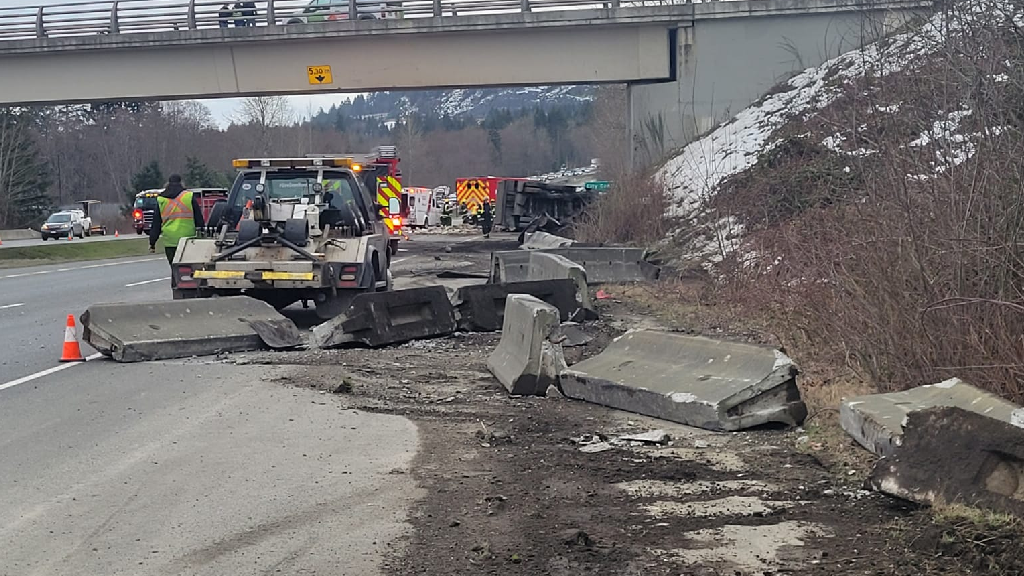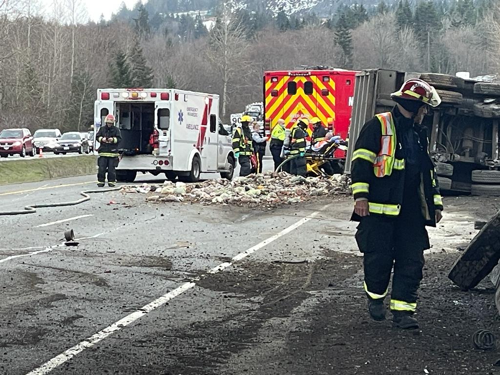 NANAIMO — A large semi-trailer carrying organic food waste overturned while travelling on the Nanaimo Parkway’s southbound lanes.