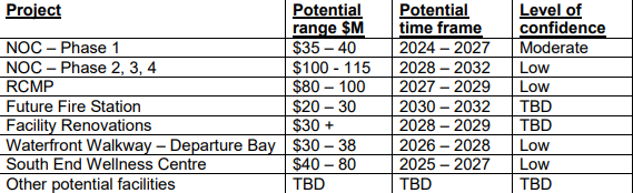 The presentation to councillors focused on four projects: Nanaimo Operations Centre (NOC), South End Community centre, new Nanaimo RCMP detachment and establishing the Departure Bay section of the waterfront walkway.