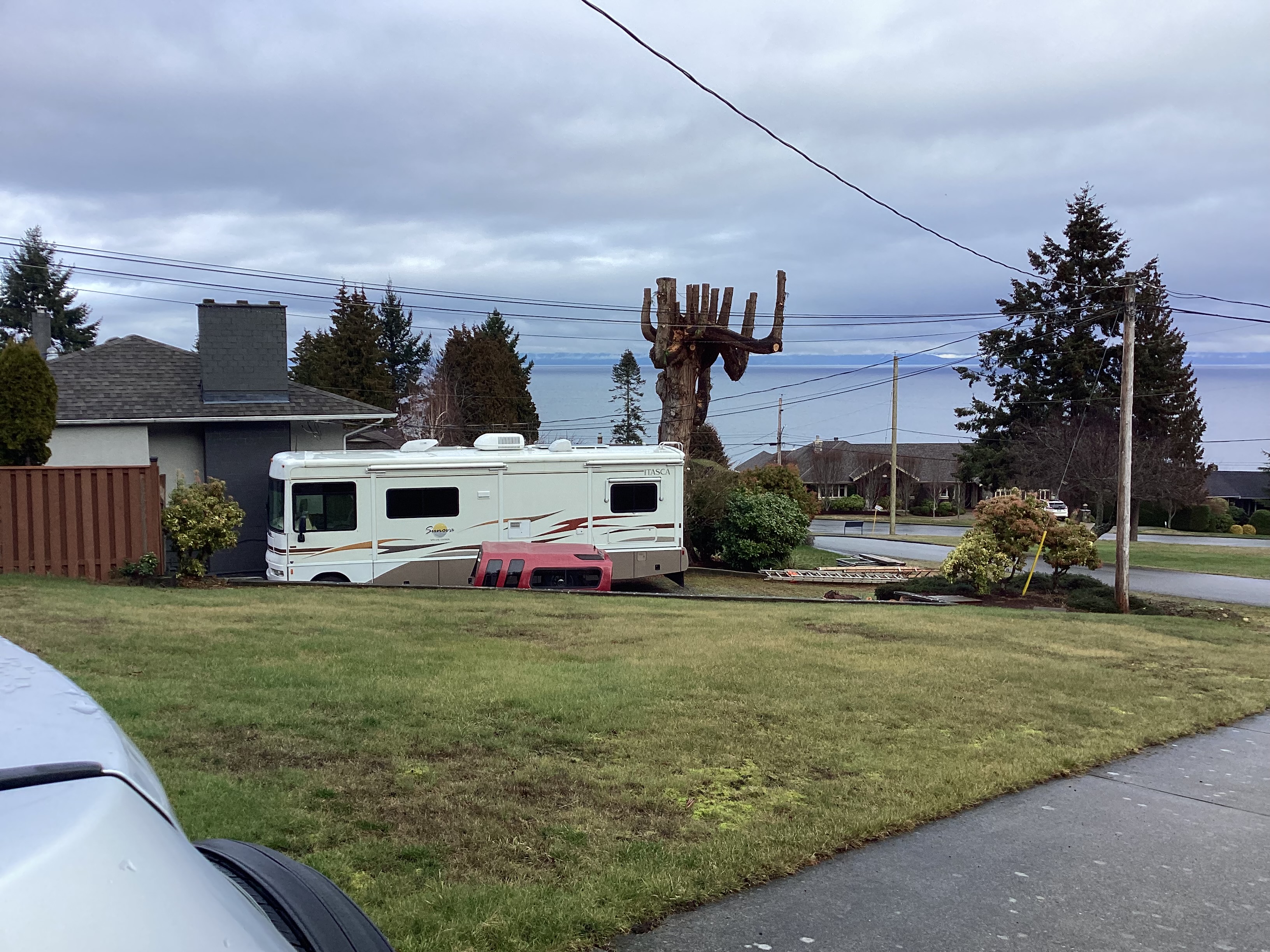 Gail Lambourne and her husband decided to reshape a cedar tree in the front yard of their Bayshore Dr. home into a wildlife-themed carving topped with a bald eagle clinging onto a salmon.