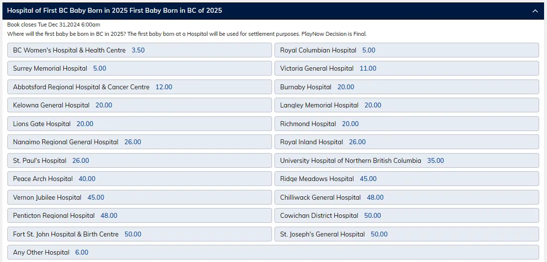 BCLC odds for which hospital will welcome the first baby of 2025. (BCLC)