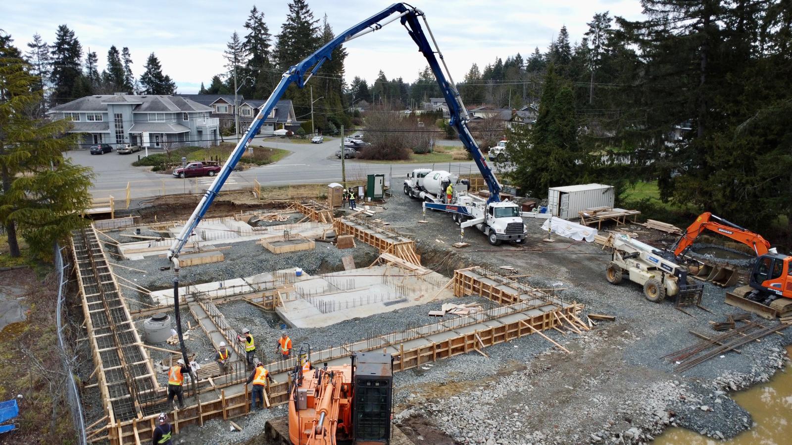 Construction is underway on vacant Lantzville Rd. land across from Caillet Rd. to create a three-storey mixed-use development involving a dozen residential units on the top two floors and three bottom-floor commercial spaces.