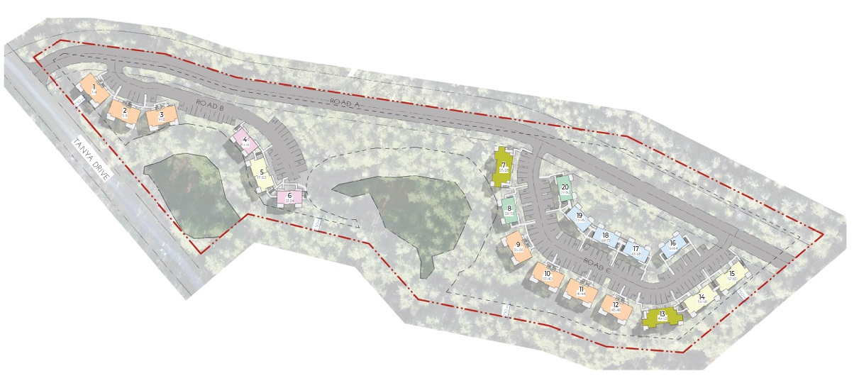 The proposed site at the end of Tanya Dr. calls for 20 townhouse-style fourplexes with 80 living units total.