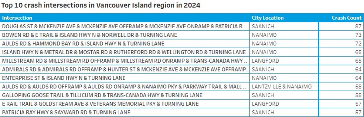 NANAIMO — A new intersection topped the highest crash location list in the Harbour City in 2024.