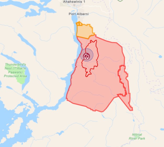 PORT ALBERNI — Strong winds pushed B.C.’s most notable wildfire closer to Port Alberni’s southern fringes, but help from more favourable weather appears imminent.