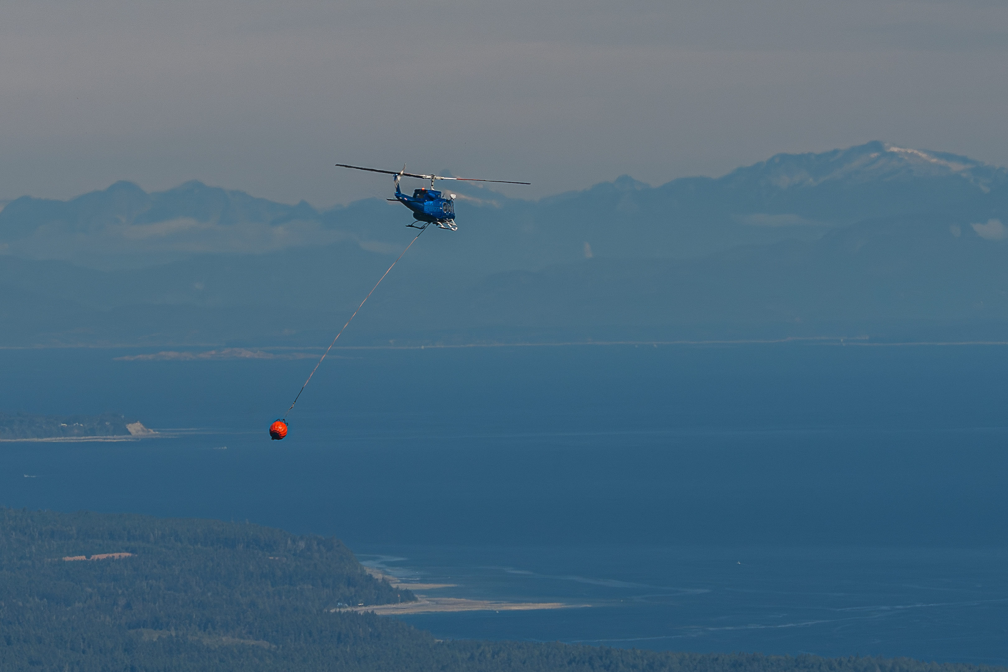 A helicopter buckets water on the Wesley Ridge fire on Aug. 9 (BCWS)