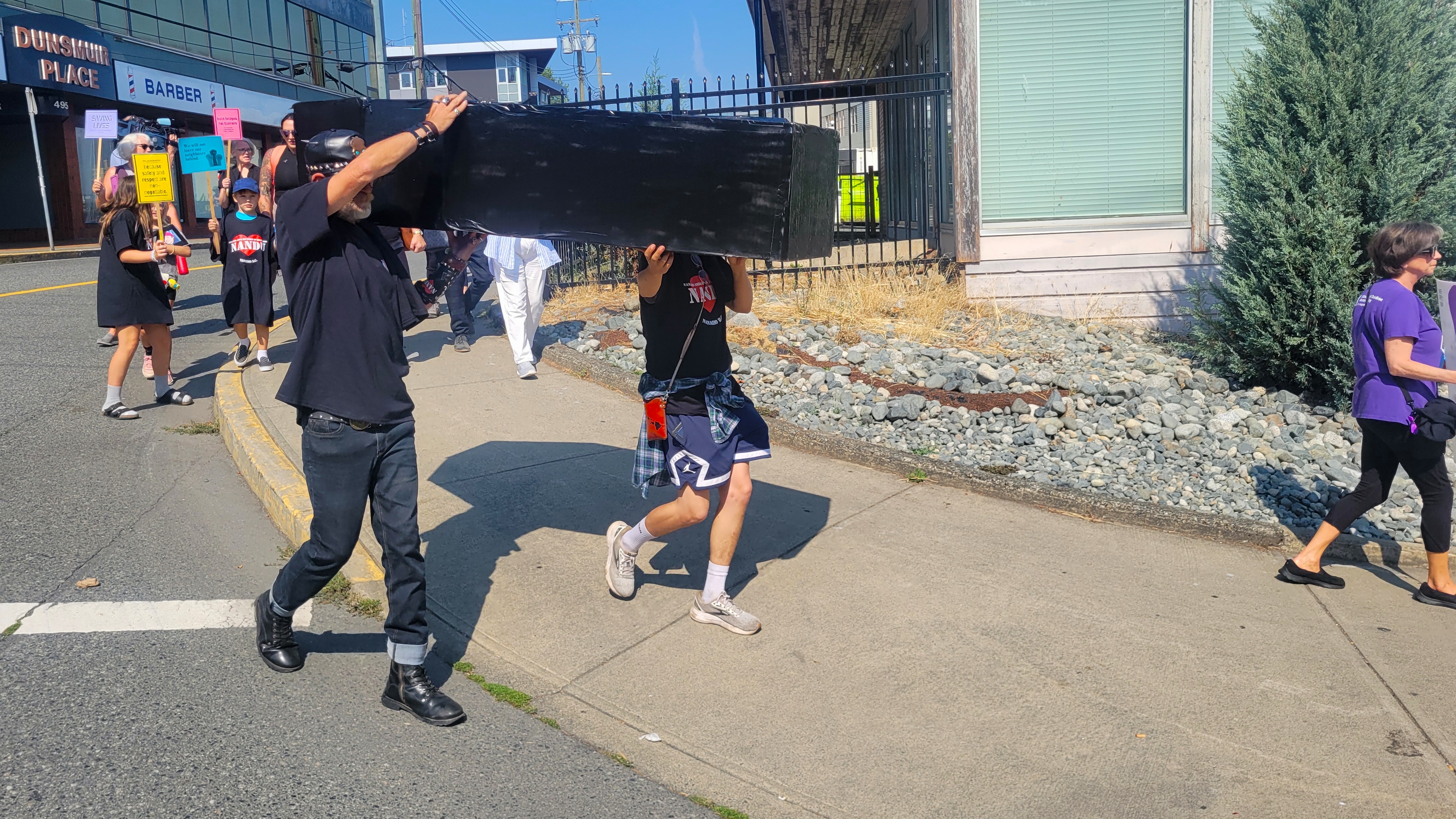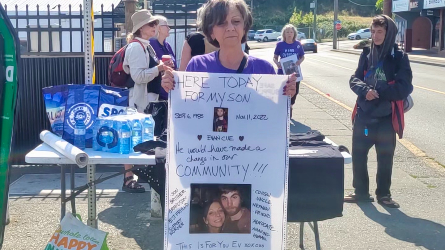 On Friday, Aug. 29, a gathering was held in front of Nanaimo’s City Hall, including Sue Fichtler with the group Moms Stop the Harm, who said if her 37-year-old son Evan had access to safe supply, he wouldn’t have died alone, locked in his bedroom in November 2022.