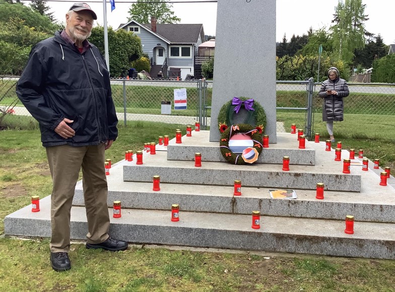 Garenkooper at the Lantzville Cenotaph in recognition of the Netherlands Liberation Day. On May 5, 1945 German occupying soldiers officially surrendered to Allied forces in Holland, concluding five years of Nazi Germany rule (Lantzville Community Hub/Facebook)