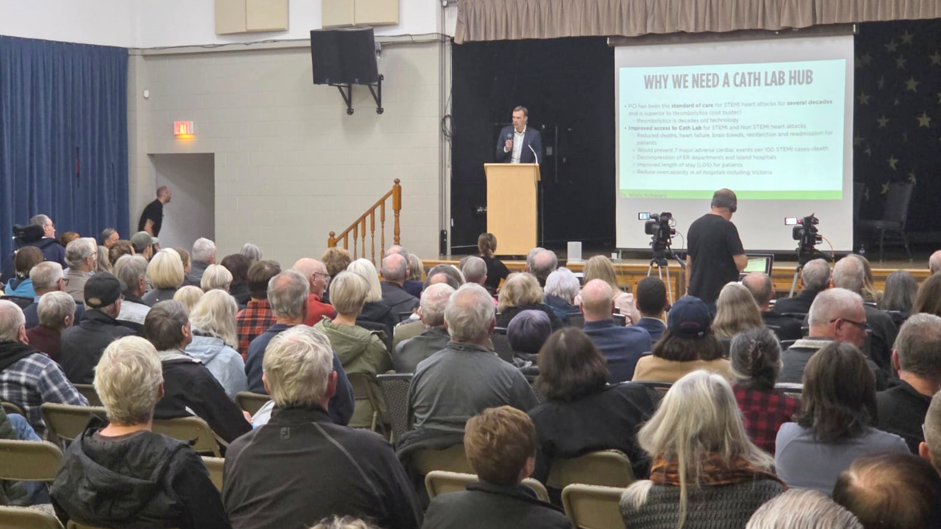 Around 250 people gathered at Nanoose Place Community Centre on Thursday, Oct. 16 to again make an empassioned plea to push the provincial government for commitments on election promises of a new patient tower and catheterization lab at Nanaimo Regional General Hospital (NRGH).