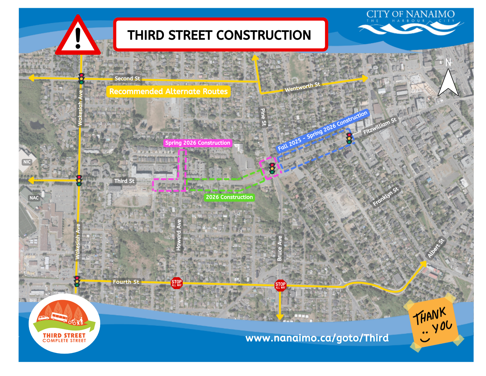 Starting this week, Nanaimo City workers will be setting up on Third St. between Watfield Ave and Milton St., with work expected to continue until at least the fall of 2026 in various stages.
