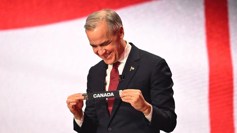 Canadian Prime Minister Mark Carney reacts after drawing Canada's name from a pot at the draw for the 2026 soccer World Cup at the Kennedy Center in Washington, Friday, Dec. 5, 2025. (Mandel Ngan/Pool Photo via AP)
