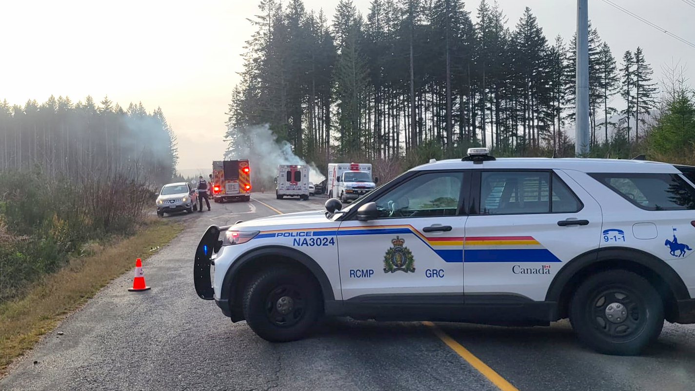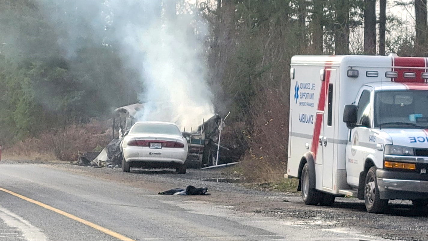 Emergency responders from Nanaimo Fire Rescue, BC Emergency Health Services and RCMP were called out to South Forks Rd., south of the intersection with Nanaimo Lakes Rd. around 9:30 a.m. on Tuesday, Dec. 9 after an RV, apparently parked on the side of the road, caught fire.