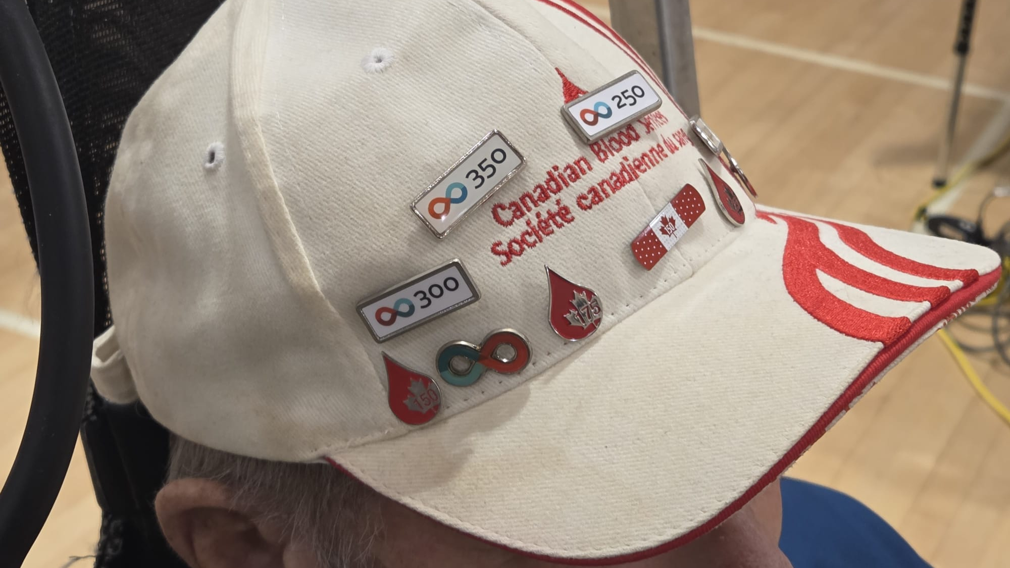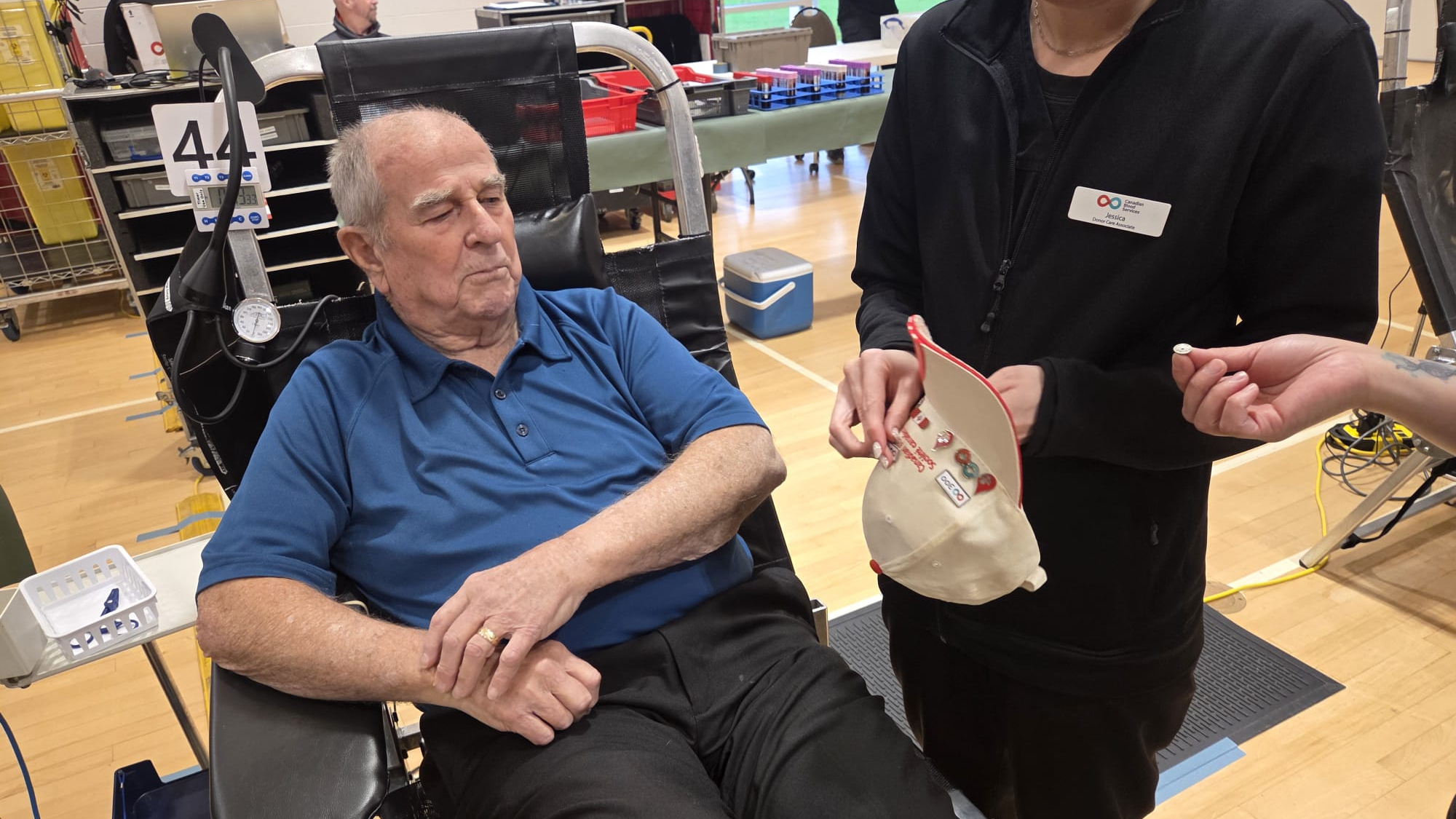 As he’s done dozens of times since moving to Qualicum Beach six years ago, Leverington strolled into the Qualicum Beach Civic Centre on Tuesday, Dec. 9, wearing his Canadian Blood Services cap dotted with milestone pins marking previous donations made across B.C.