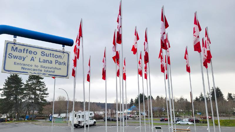 Nearly two-dozen Canadian flags were displayed at the entrance to Nanaimo’s Maffeo Sutton Park in March, a show of national unity and patriotism. (Jordan Davidson/NanaimoNewsNOW)