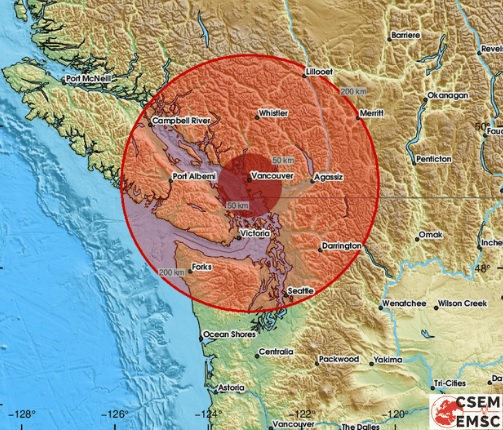 A magnitude 4.8 earthquake was recorded just north of Sechelt on Feb. 21 in the early afternoon, with mid-Island residents reportedly feeling the effects. (Euro-Mediterranean Seismological Centre via Twitter)