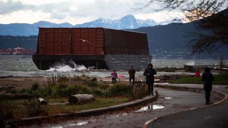 Barge drifts aimlessly through Vancouver waters before beaching itself
